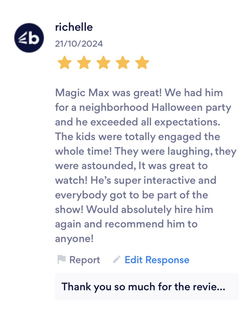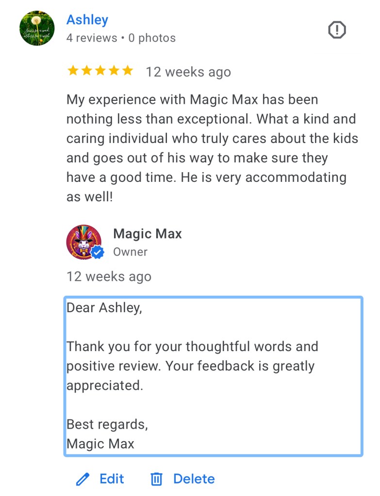 “Magic Max made my daughter’s birthday unforgettable! We’re still talking about it!” – Happy Parent